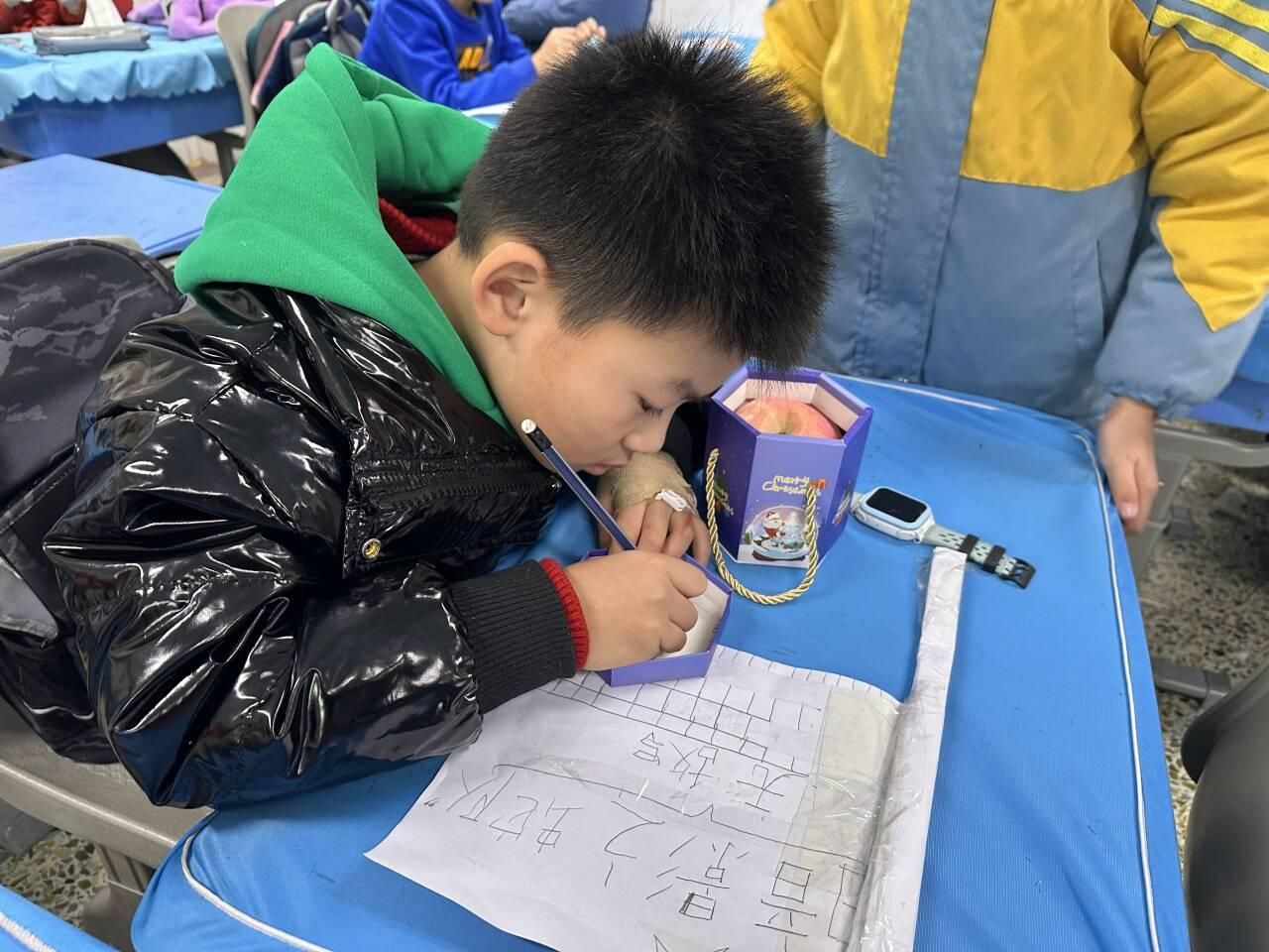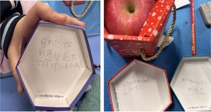 “送平安”环节,同学们充满了对未来的期许。苹果寓意着平安顺遂,承载着美好的祝福。大家在平安果盒子上写下新年小目标与愿望,轻轻放入盒中,宛如种下一颗颗希望的种子。有了努力的目标,同学们也有了前行的力量。