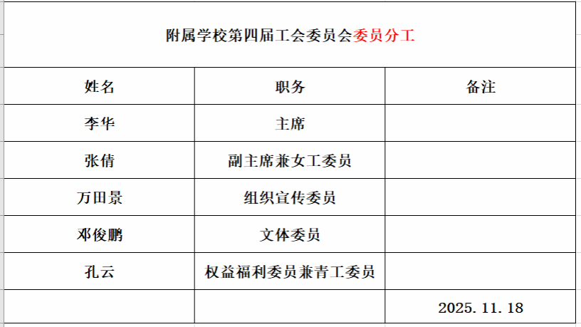 2025年11月18日,附属学校第四届工会委员会首次会议在劝学楼306室召开。会议由李华主席主持。他首先欢迎新委员的加入,随后明确了各位委员的职责分工,并就近期重点工作进行了部署。新一届工会班子将凝心聚力,切实为教职工办实事、办好事,服务好全体教职工。