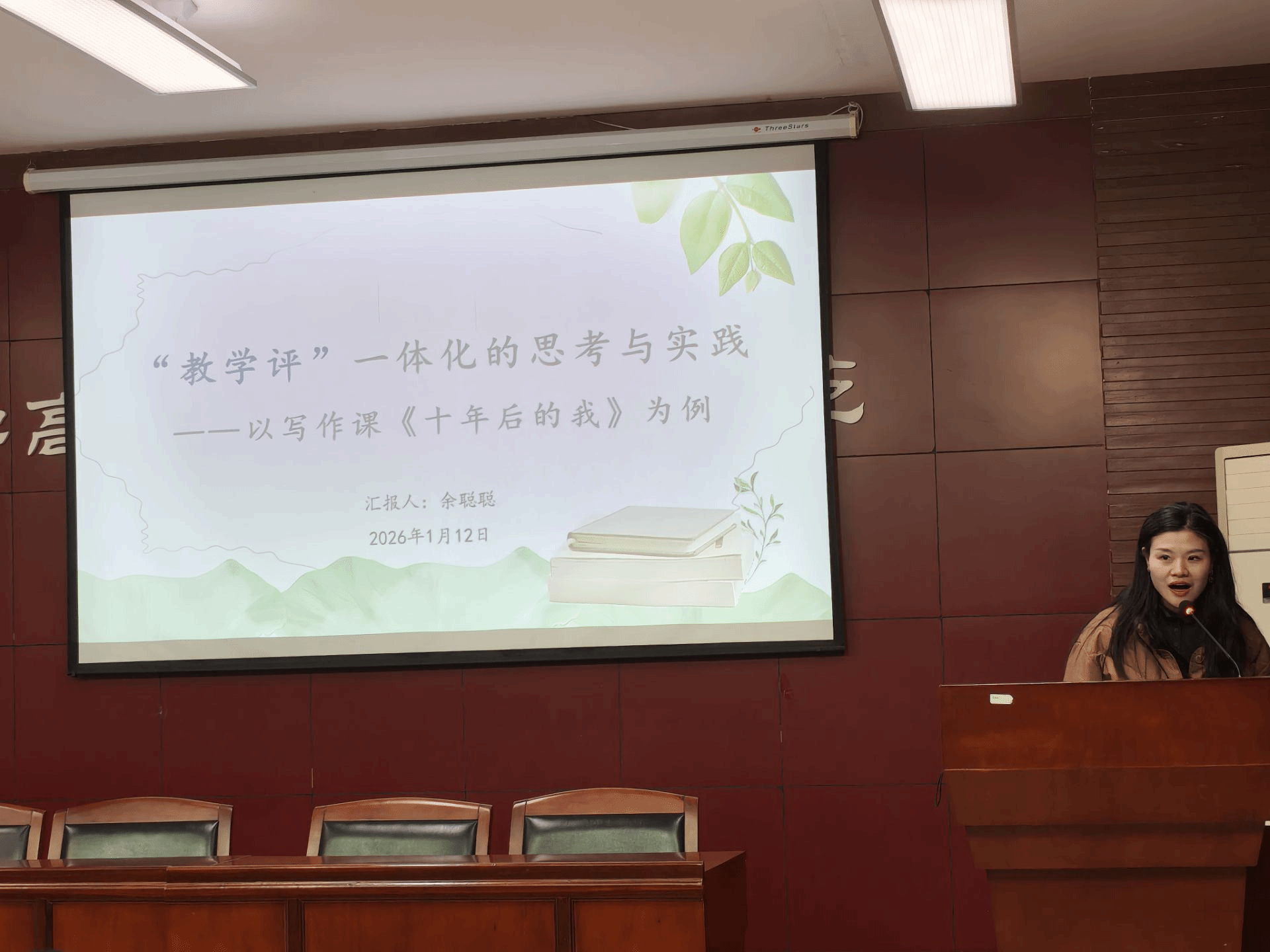 接着,余聪聪老师以写作课《十年后的我》为例,阐述了“教—学—评”一体化的思考与实践。她基于追求理解的教学设计理论,介绍了以“大概念”为核心、以“生成性/理解性目标——评估证据(理解性实操)——学习活动”为逆向设计框架的教学设计思路,强调目标、教学与评价应保持一致。余老师重点分享了如何构建多元动态的评价体系,包括引导学生进行自评互评、设计任务驱动的过程性评价,以及运用表现性评价、SOLO分类评价等多种方法收集证据、改进教学,从而实现“教—学—评”的有机闭环与学生素养的有效转化。余老师的分享逻辑严谨、案例具体,为写作教学如何实现目标、过程与评价的一致性提供了可操作的框架。