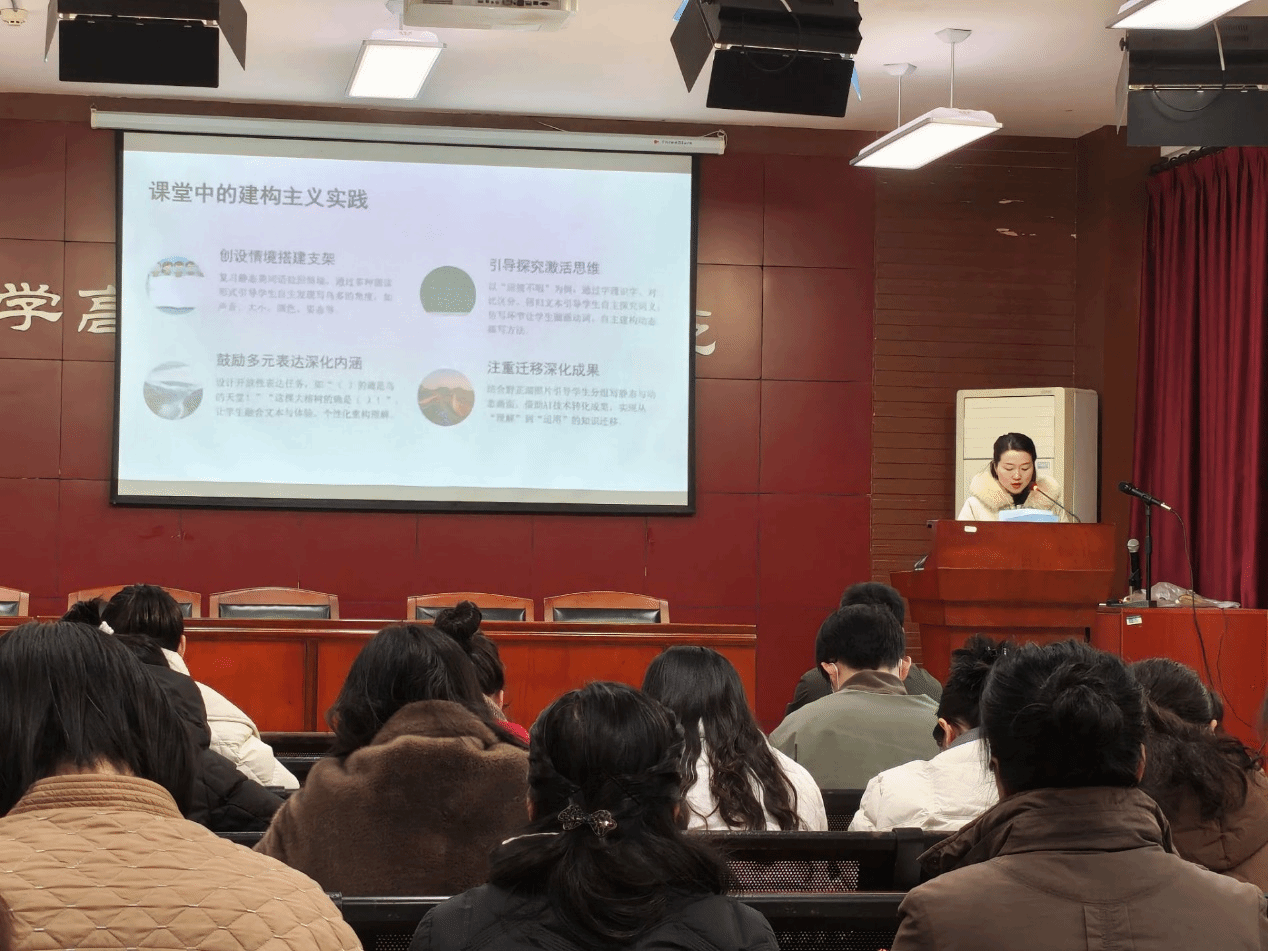 首先,朱迪敏老师结合课例《鸟的天堂》第二课时,分享了《建构主义理论在语文教学中的应用》。她阐释了建构主义“以学生为中心”的核心思想,并详细介绍了如何在课堂中通过创设情境、引导自主探究、鼓励多元表达及注重知识迁移等路径,帮助学生主动建构对文本的理解与表达方法。朱老师还对此次开放月中教学的不足进行了反思,提出了优化探究流程、释放学生个性化表达空间和联结生活实践等具体改进方向,体现了其在建筑主义理论指导下的持续思考与实践探索。