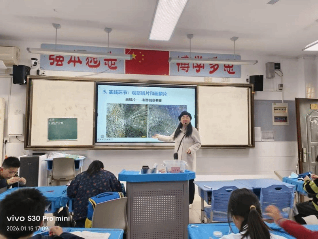 在应用拓展环节,老师们通过鲨鱼皮泳衣、鱼鳞结构灵感的飞机涂层、鱼鳞胶原蛋白提取等真实案例,让同学们切实感受到鱼鳞蕴含的巨大科技价值。实践操作环节更是将课堂氛围推向高潮,孩子们手持放大镜仔细观察鳞片的纹路,通过加水实验对比鳞片形态变化,还充分发挥创意,将鳞片轮廓制作成独特的创意书签,在动手实践中深化了对知识的理解与记忆。