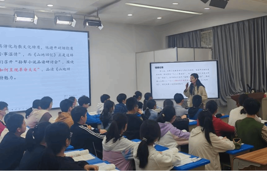 活动中,余聪聪老师展示《山地回忆》第二课时课例,以 “凡人小事如何呈现革命大义” 为核心议题,设计三层递进式学习任务,借助冰山模型剖析人物品质、对比苦境与温情、赏析以小见大写法,以任务驱动学生深度思考,实现思维与素养同步提升。授课结束后,余聪聪老师从教学依据、施教策略、达成评价三方面进行说课,完整呈现思辨阅读课堂构建思路。