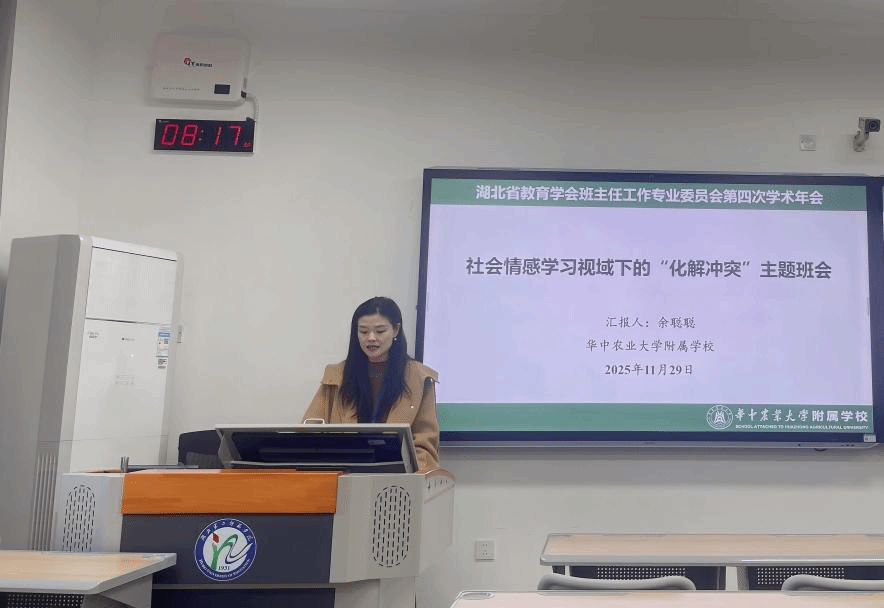 2025年11月29日上午,湖北省教育学会班主任工作专业委员会第四次学术年会在武汉举行。我校青年教师余聪聪作为洪山区教师代表受邀做汇报发言,分享了题为《社会情感学习视域下的“化解冲突”主题班会》的活动设计与实践经验,获得了与会专家和教育工作者的关注与好评。